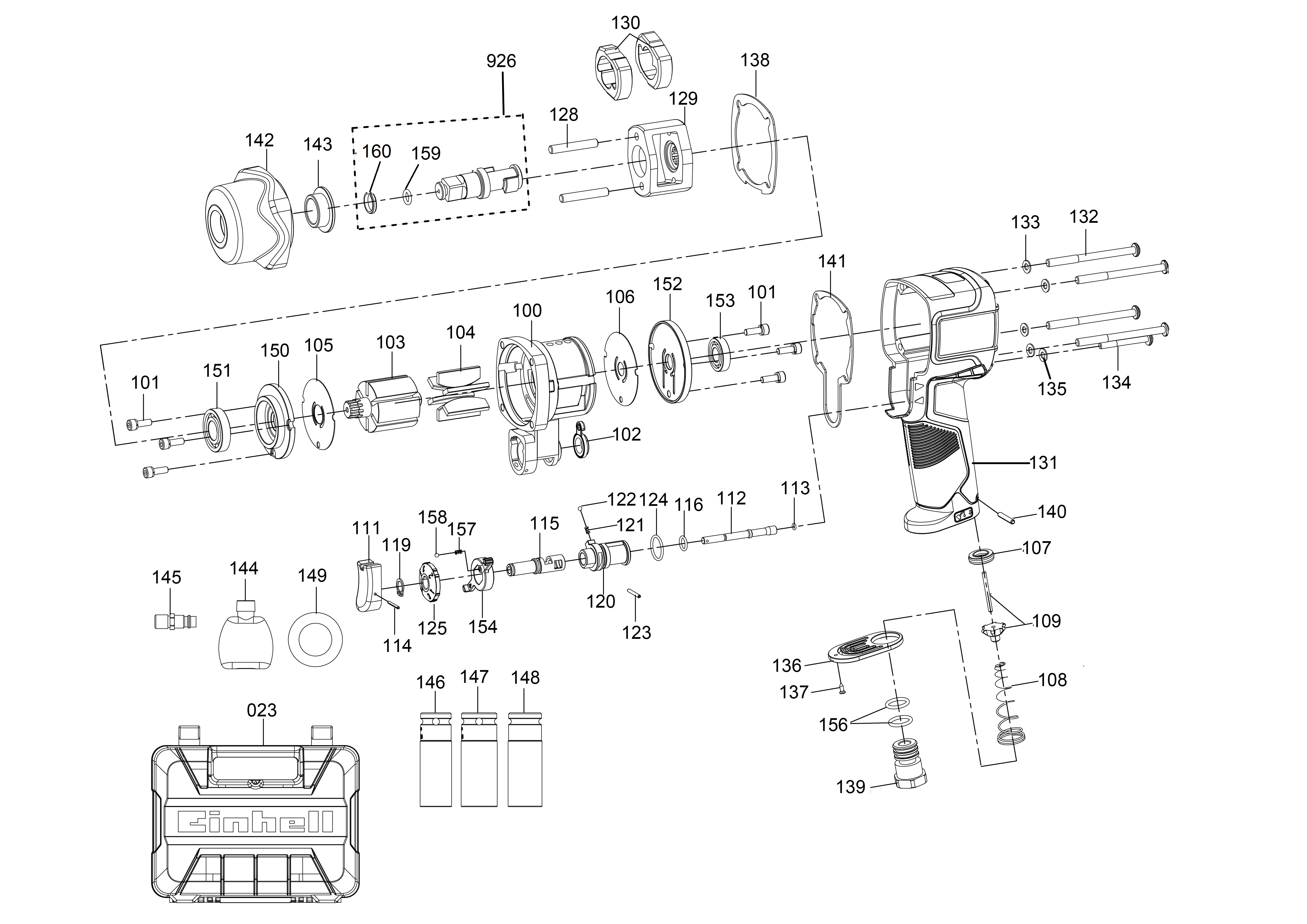 El atornillador de impacto de aire comprimido TC-PW 610 Compact de Einhell se envía incluyendo los accesorios siguientes: 3 llaves de vaso con casquillo de plástico (17/19/21 mm), 1 botella de aceite, 1 boquilla enchufable, 10 m de cinta obturadora de rosca. En el práctico maletín de transporte y conservación pueden guardarse de forma segura y clasificada el atornillador de impacto de aire comprimido y accesorios y está listos para el uso en cualquier momento.